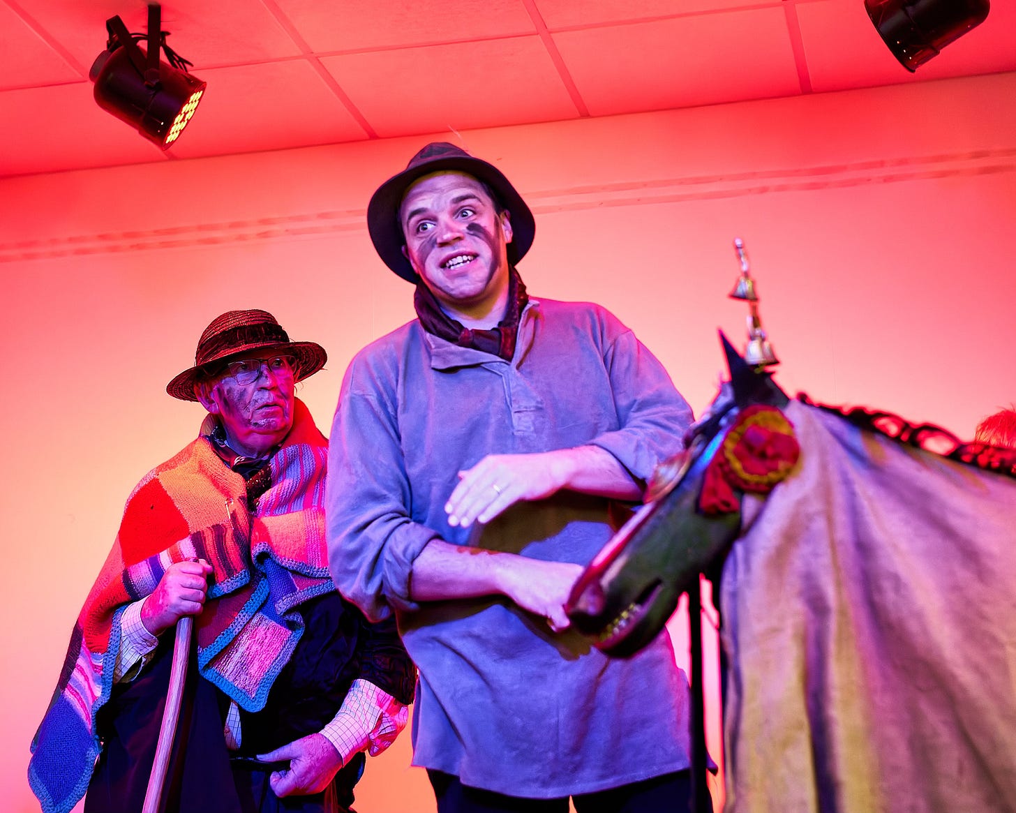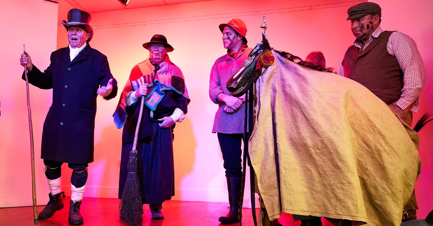 A constant flow of jokes is shared as the battered old horse snaps, dances and wavers. Performers muddle their lines and break character by laughing at their mistakes. This year’s script amps up the drama: it’s the farmhand, carrying electric jump leads for the horse, who gets accidentally electrocuted, collapses, dies, and is miraculously revived by tonic. An unexpected twist that stays true to the classic death-and-revival motif, echoing ancient midwinter symbols of autumn’s end and the joyful promise of agricultural spring renewal.